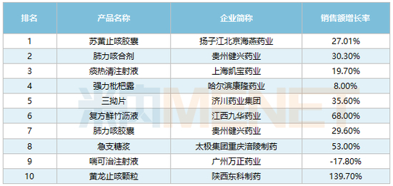 从销售额增长率来看,除了广州万正药业的喘可治注射液,其余9个品牌均实现正增长。8个产品涨逾10%,其中陕西东科制药的黄龙止咳颗粒强劲增长140%,江西九华药业的复方鲜竹沥液大涨68%,太极集团重庆涪陵制药的急支糖浆大涨53%。
