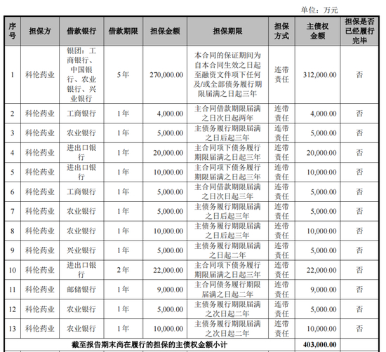 截至招股书发布(2022年9月),科伦药业为川宁生物提供担保且尚在履行的债权笔数仍有13笔,总金额达到40.3亿。
