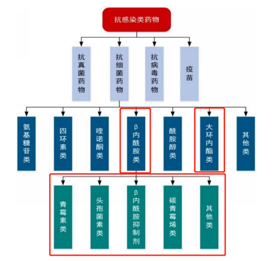 抗生素可分为β-内酰胺类抗生素、氨基糖苷类抗生素、四环类抗生素、喹诺酮类抗生素、酰胺醇类抗生素、大环内脂类抗生素等7大类,当前以头孢菌素和青霉素为主的 β-内酰胺类抗生素约占世界抗生素市场的70%。