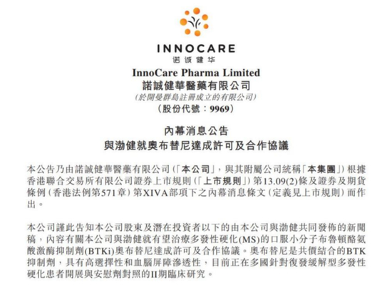 2021年7月,诺诚健华以最高9.4亿美元向渤健License out奥布替尼在MS领域全球独家权利,以及中国以外区域的部分自身免疫性疾病的独家权利。