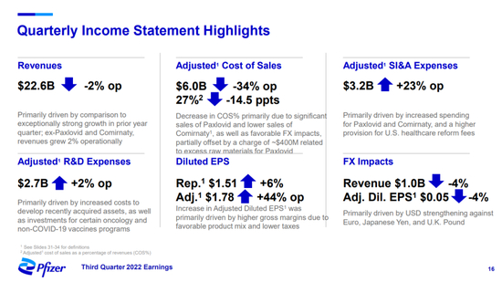 此前辉瑞首席执行官Albert Bourla曾经表示,辉瑞预计从2025年到2030年的收入损失将高达180亿美元,因为一些关键药物的专利即将到期。悬在头上的专利到期利刃,更促使辉瑞要加快降本增效,全力聚焦创新。其Q3报告中也显示了这点,辉瑞2022年第三季度销售总成本为60.63亿美元,同比下降39%。2022年辉瑞第三季度的研发(R&D)费用与去年同期相比在运营方面增加了2%。