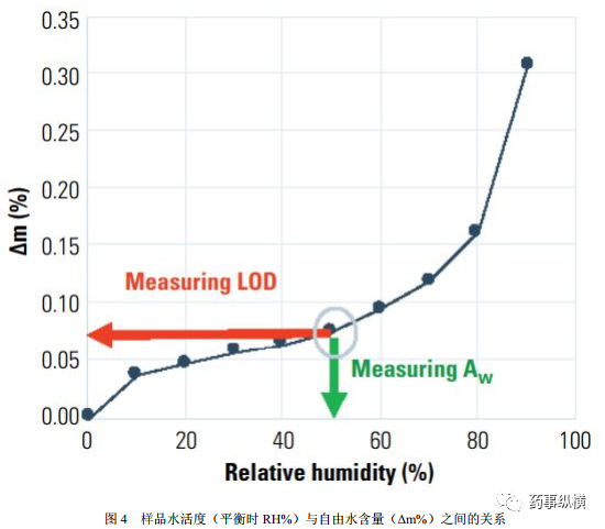 吸附等温线对于每种物料都是唯一的,并且是物料固有的特性。如果有吸附等温线,则定义自由水含量与水活度之间的关系,两个参数可以通过插入值从另一个参数导出。观察吸附等温线,可以通过测量游离水含量(y轴,通过LOD)或水活度(x轴)来评估样品的实际水分状态,如图4所示。但是,必须注意吸附等温线,因为某些物料可能会因干燥或暴露在高湿度下而发生结构发生变化,从而导致吸附等温线发生变化。