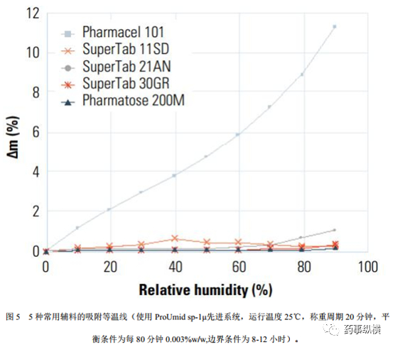 了解混合物中的水分迁移需要了解各组分在目标温度下的吸附等温线。吸附等温线对于每种物料和产品都是唯一的,它们提供了预测系统中水分最终迁移量所需的所有信息。图5提供了一些常用辅料的吸附等温线的例子。