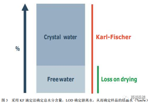对于乳糖等辅料,可以使用LOD和KF值来计算物料中的结晶水。通过KF测定水含量与通过LOD测定的游离水含量之差即样品中的结晶水含量,如图3所示。