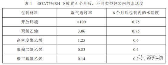 水活度达到平衡的速度取决于物料之间的水活度差异、水分子在物料中的扩散能力、水分迁移的可用表面积、需要迁移的水分量以及包装的水分阻隔性能。表1显示了在40℃/75%相对湿度下存放6个月后,不同包装类型内的水活度。如聚氯乙烯的水活度为0.75,聚氯三氟乙烯中的水活度为0.2之间的差异所表明的那样,内部包装的水活度高度依赖于包装材料的湿气透过率(MVTR)。包装的MVTR可用于预测产品的吸水速度,并设置保质期和储存条件。