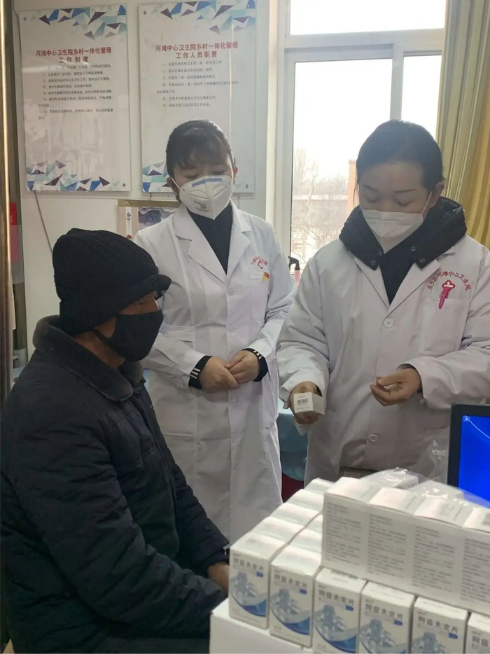 甘肃省东乡县河滩镇汪胡村卫生院院长马玲燕、村医韩胜红为村民开药