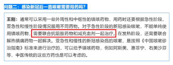 华西医院王刚教授指出,对于急性阶段的新冠感染咳嗽,不能单纯使用镇咳药物,需要联合抗阻胺药物和减充血剂一起治疗。