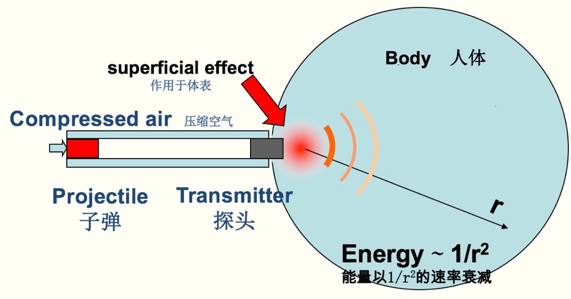 发散式的能量是发散的,能量在皮肤表面最大,它的能量随着深度的增加而急剧消散,发散式冲击波每进入人体1厘米,能量就大概衰减50%。