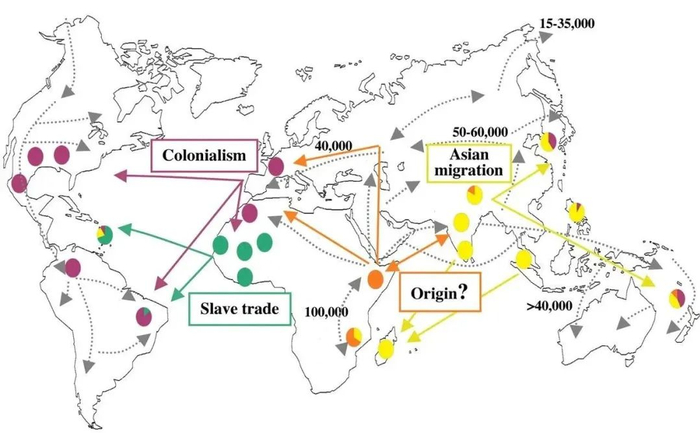 研究者利用比较基因组学,证明所有现存的麻风病病例都是由一个克隆引起的,通过对非常罕见的单核苷酸多态性的分析,可以追溯到该克隆在全世界的传播。这种疾病似乎起源于东非或近东非地区,并随着人类的连续迁移而传播。欧洲人或北非人在过去500年内将麻风病引入西非和美洲。图源:Science