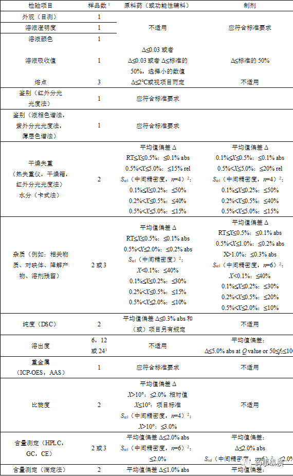 分析方法转移可接受标准各国药典、指导原则未规定其可接受标准,根据《中国药品检验标准操作规范》相关规定,可接受标准可参照下表
