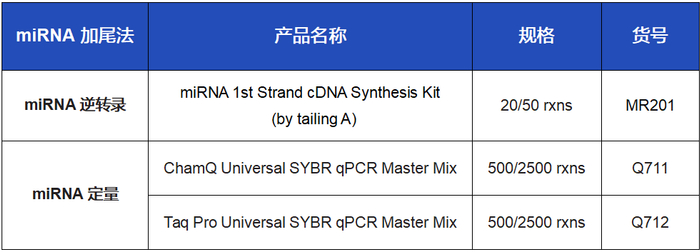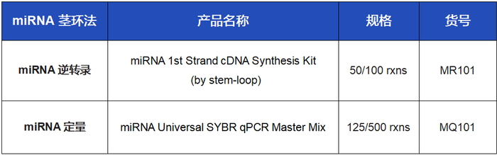 Vazyme为您提供茎环法miRNA专用试剂盒Vazyme #MR101,后续定量时需搭配使用miRNA定量反应的专用预混液Vazyme #MQ101。