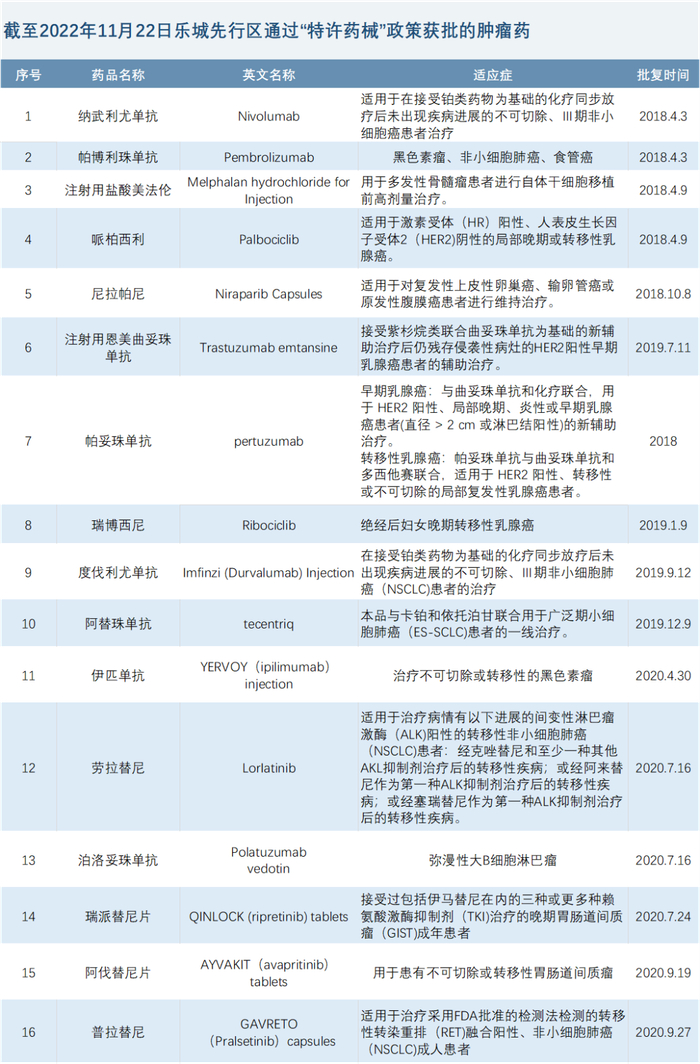 除了基石药业、烨辉医药,默沙东、罗氏、安斯泰来、先声药业、再鼎医药等中外制药企业都通过“特许药械”政策将产品引入了乐城先行区。