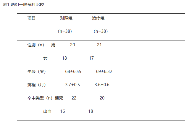 应用随机数字表法,随机分为治疗组和对照组。治疗组和对照组各38例,两组患者在性别、年龄、病程、卒中类型等方面比较,均无显著性意义差异(P>0.05),具有可比性,见表1。