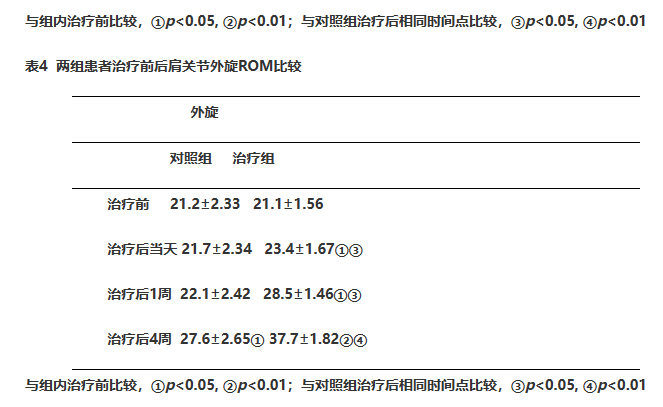 治疗组患侧肩关节ROM前屈、外展、外旋在治疗后当天,治疗后1周(P<0.05)、治疗后4周(P<0.01)与治疗前比较差异有显著性意义;对照组在治疗后当天、治疗后1周患侧肩关节前屈、外展、外旋较治疗前均有改善,但无统计学差异,治疗后4周与治疗前比较差异有显著性意义(P<0.05)。治疗组患侧肩关节ROM前屈、外展、外旋与对照组比较在治疗后当天,治疗后1周(P<0.05)、治疗后4周(P<0.01)差异均有显著性意义。见表3及表4。