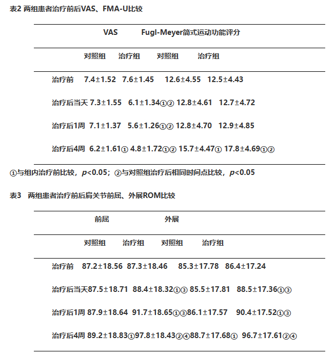 Result: Immediately after treatment , 1 and 4 week later, VAS of treatment groups were significantly lower than those before treatment (P<0.05), while there was no significant difference between pretreatment and immediately after treatment and 1 week late in the control group.Immediately after treatment , 1 and 4 week later, VAS of treatment groups were significantly lower than those control group (P<0.05).The ROM of shoulder flexion, abduction , external and rotation in treatment groups improved significantly after treatment immediately and after 1(P<0.05) and 4 weeks(P<0.01) than that of pre- treatment, while there was no significant difference between pretreatment and after treatment immediately 1 week later in the control group. Immediately after treatment , 1(P<0.05) and 4 week later(P<0.01), the ROM of shoulder flexion, abduction , external and rotation of treatment groups were significantly improvement than those control group.There were no changes in two groups for Fugl-Meyer upper-extremity scores immediately after treatment and 1 week later, but the scores increased significantly after 4 weeks in two groups (P<0.05).