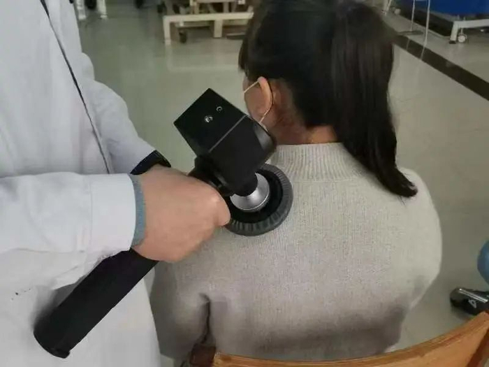 再利用深层肌肉刺激仪,针对深部肌肉组织进行击打与振动,使紧张的张力带得以放松,肌筋膜得以松解,不仅可以减轻肌筋膜疼痛,而且可以降低肌肉的痉挛,从而有利于对痉挛肌肉的牵张,增加关节的被动活动范围。