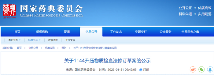 我委拟修订《中国药典》2020年版通则1144 升压物质检查法,为确保标准的科学性、合理性和适用性,现将拟修订标准公示征求社会各界意见(详见附件)。