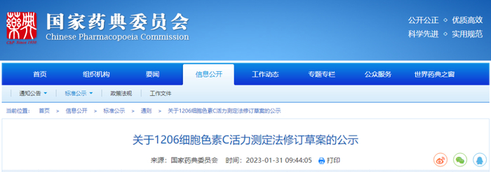 我委拟修订《中国药典》2020年版通则1206 细胞色素C活力测定法,为确保标准的科学性、合理性和适用性,现将拟修订标准公示征求社会各界意见(详见附件)。