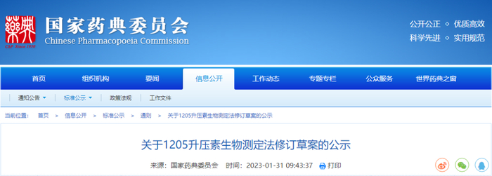 我委拟修订《中国药典》2020年版通则1205 升压素生物测定法,为确保标准的科学性、合理性和适用性,现将拟修订标准公示征求社会各界意见(详见附件)。