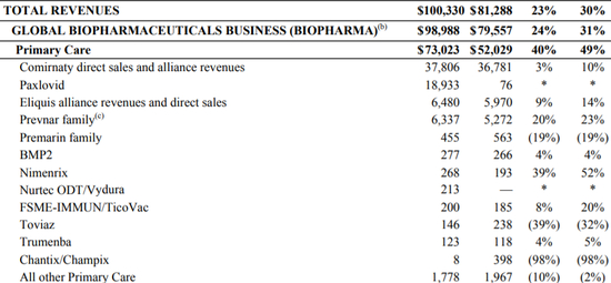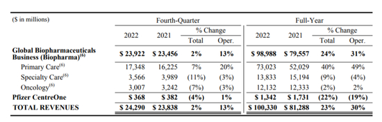 2023年1月31日,辉瑞公布了2022年的销售业绩,其总营收达1003.3亿美元,同比增长23%,成为首个销售额规模超过1千亿美元的制药巨头。在1003亿美元的销售额中,普通护理业务(Primary Care)同比增长40%达730.23美元,专科护理业务(Specialty Care)同比下降9%为138.33亿美元,肿瘤业务(Oncology)同比下降2%,为121.32亿美元。