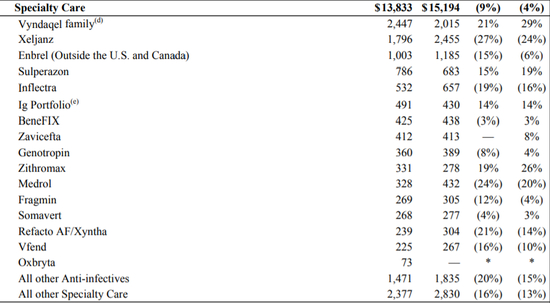 专科护理业务方面,罕见病药物tafamidis增长强劲,销售额同比增长21%,达24.47亿美元,但除了tafamidis,其它产品的销售额几乎都在下降,所以该业务的总营收同比下降了9%。其中托法替布下降27%至17.96亿美元,依那西普下降15%至10.03亿美元。但有意思的是,老药头孢哌酮/舒巴坦销售额同比增长15%,达7.86亿美元,其增量极有可能来自中国市场的贡献。