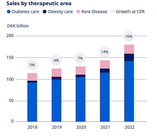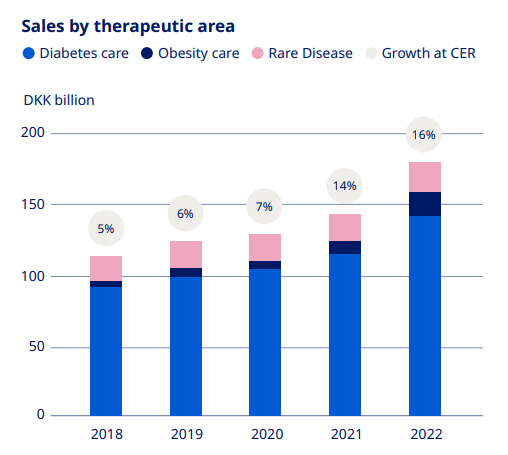 2023年2月1日,诺和诺德公布了2022年财报。报告显示,诺和诺德全年总销售额为1770亿丹麦克朗(约为262亿美元),以丹麦克朗计算,销售额增长25%(以恒定汇率计算增长16%)。诺和诺德营业利润增长28%(以恒定汇率计算增长15%),达到748亿丹麦克朗。