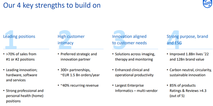 飞利浦在发布财报时强调了其几个关键优势:领先的市场地位、广泛的客户群、有意义的创新、生态系统伙伴关系、强大的品牌和员工支持。