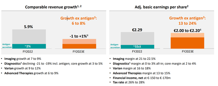 瓦里安业务(占比14%):这是瓦里安被收购后,第一次被纳入一个完整的财政年度。营收30.75亿欧元(+136.5%),主要原因在于瓦里安的收购在2021年4月15日完成。可比增长+6.5%。