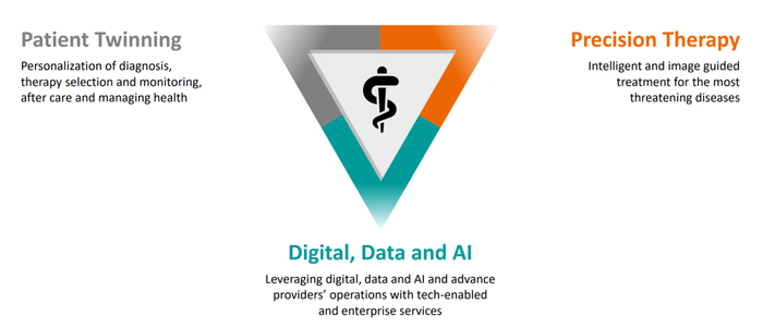 在1月初的大会上,西门子医疗提出,其拥有的独特的能力为“患者孪生、精准治疗、数字化&数据和人工智能”。其中,影像、诊断业务支撑患者孪生;瓦里安、临床治疗业务支撑精准治疗;数字化&数据&人工智能贯穿始终。
