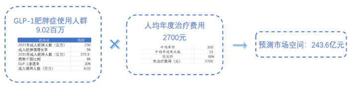 据《中国居民营养与慢性病状况报告( 2020 年)》数据显示,中国成人的超重比例为 34.3%,肥胖的比例为 16.4%, 2021 年中国肥胖人数为 2.3 亿人,减肥药物存在巨大的市场空间;根据国金证券的测算,中国GLP-1药物在肥胖患者中市场空间将达到 243.6 亿人民币。
