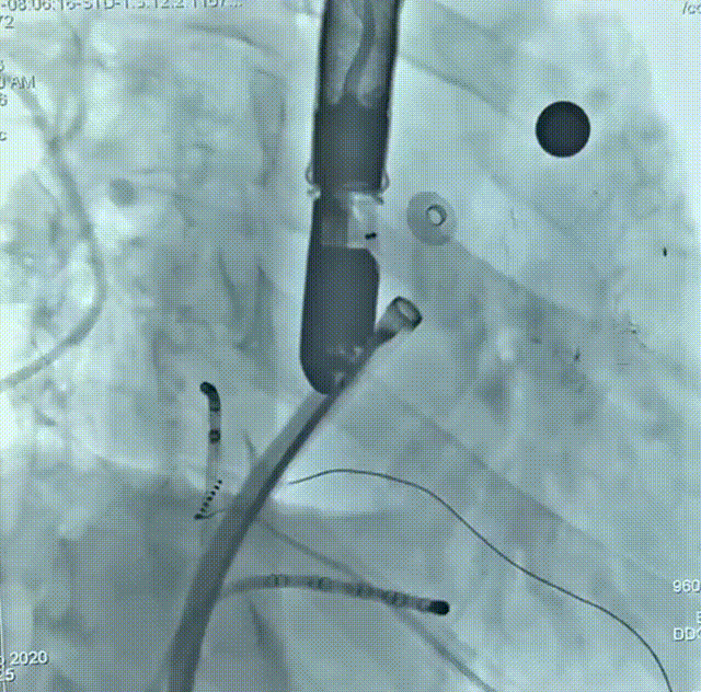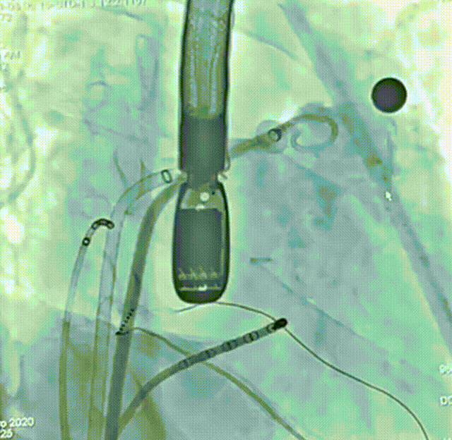 患者为51岁男性,因“反复心悸7-8年”入院,有明确的脑梗死病史,近4年内出现2次脑梗死,右侧肢体存在活动障碍后遗症,考虑由房颤相关血栓栓塞造成。术前动态心电图示心律不齐,房颤律,心脏彩超示左右房内径增大、左室收缩功能减低;房颤CHA₂DS₂-VASc评分4分、HAS-BLED评分4分,血栓栓塞及出血风险均较高;食道超声联合CT重建示左房及心耳内未见明显血栓形成,左心耳偏大。结合评估结果和患者及家属意愿,拟使用我国自主研发的Bio-Lefort生物可降解左心耳封堵器,行导管消融+左心耳封堵“一站式”手术。射频消融完成后实施左心耳封堵,术中牵拉试验提示封堵器稳定,符合释放原则,整个封堵器释放过程一气呵成,术后造影显示无残余分流,术后超声证实封堵器位置良好,封堵结果十分理想,顺利完成手术。