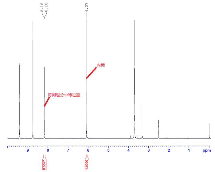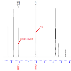 因此我们选择1.3.5-三甲氧基苯作为内标物。已知内标物的特征氢化学位移值在6.1,溶剂峰位置在3.3和2.5,因此从之前打过的氢谱中选择8.1附近的峰作为特征峰,然后再根据分子量和对应氢的个数计算称样量,最后根据公式计算得出目标物含量结果。