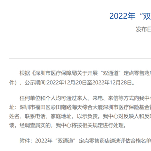 近日,经深圳市医疗保障局官网公示,国药控股深圳大药房、龙岗大道大药房、龙岗布澜路大药房、罗湖文锦路大药房、南山桃园路大药房、南山朗山路大药房、光明凤新路大药房、福田福华路大药房、龙华和平东路大药房、福田新洲路大药房、宝安前进路大药房,国控深圳延风新稀特大药房、新安大药房、光明大药房共计14家药房成功获得深圳市“双通道”定点零售药店资质,民生保障再强化!