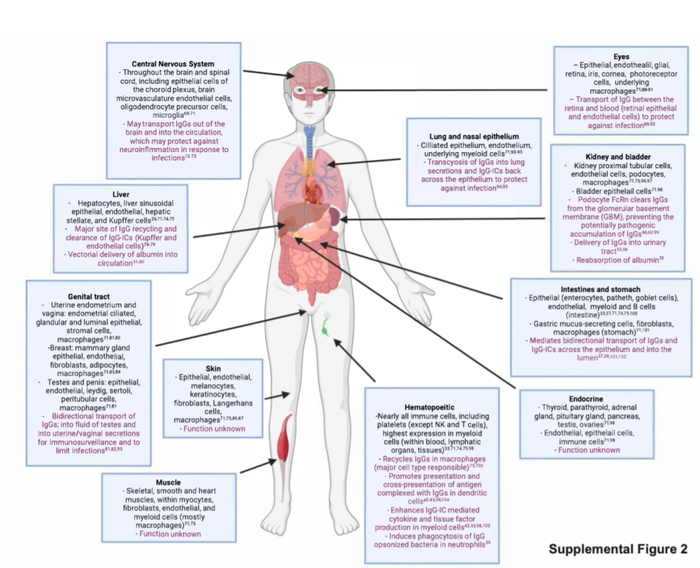 在新生儿阶段以后,FcRn在成年人中也有表达,广泛存在于人体组织中,包括上皮细胞、内皮细胞、肝细胞、角质细胞以及各种造血细胞类型。在免疫细胞中,FcRn在髓系细胞中的表达尤其高,如单核细胞、组织驻留巨噬细胞、树突状细胞(DC)和中性粒细胞;在淋巴细胞中,B细胞中存在低水平的FcRn,但在T细胞或自然杀伤(NK)细胞中未检测到FcRn。