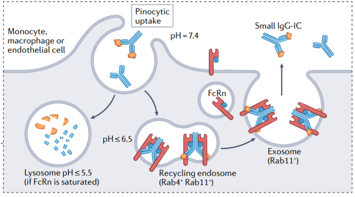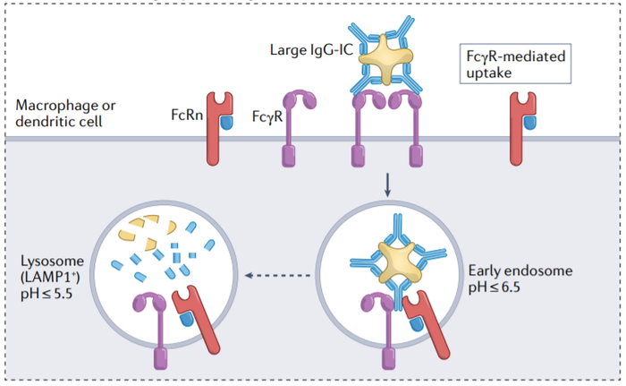 另一方面,当FcRn缺失时,大型多聚体IgG-IC不能有效回收,但降解速度更快。多聚IgG IC结合细胞表面(中性pH)上的IgG的Fc受体(FcγRs),在那里它们通过受体介导的内吞作用被吸收到内体中,允许在酸性pH下与FcRn和FcγR共同结合。多聚IgG-ICs主要被运送到FcRn+LAMP1+溶酶体,这可能对FcRn的抗原呈递功能很重要。