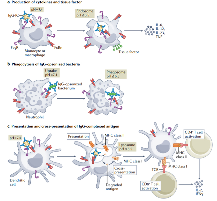 FcRn和FcγRs在髓系细胞的细胞表面和细胞内高水平表达,其直接参与对IgG-IC的先天免疫反应。例如,IgG-IC促进先天免疫细胞产生促炎细胞因子的能力涉及FcRn。IgG-IC在中性pH条件下结合细胞表面的FcγRs受体,当IgG-IC被吸收到内体中时,它们在微酸性pH下与FcRn结合。作为对IgG-IC的反应,FcRm积极诱导中性粒细胞、单核细胞、巨噬细胞细胞和树突状细胞产生促炎细胞因子IL-12、IL-23、TNF和IL-6。