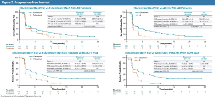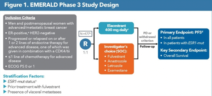 与氟维司群(Fulvestrant)或芳香化酶抑制剂选项的标准治疗方案(SoC)相比,EMERALD均达到了它的两个主要终点:总体人群中的无进展生存期(PFS)和雌激素受体1(ESR1)突变亚组中的无进展生存期。