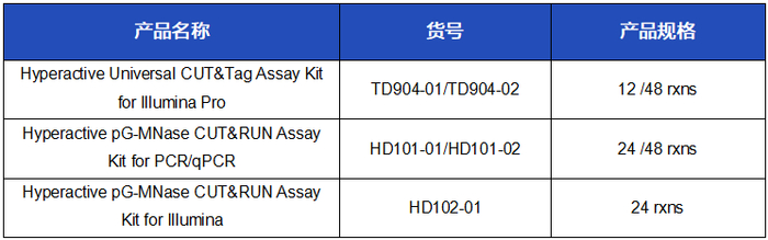 ●Hyperactive pG-MNase CUT&RUN Assay Kit for PCR/qPCR(Vazyme #HD101)与Hyperactive pG-MNase CUT&RUN Assay Kit for Illumina(Vazyme #HD102)是姊妹产品,前者为CUT&RUN定量试剂盒可替代ChIP-qPCR,而后者则是CUT&RUN建库试剂盒,不同产品满足众多科研工作者的不同需求。