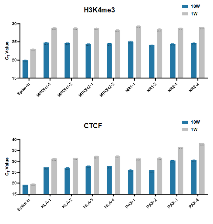通过梯度投入Spike in DNA(1 pg / 10,000 cells)对不同细胞投入量测得的CT值进行均一化校正,校正后的CT值差值小于1,目的基因富集程度趋于一致。因此,使用本试剂盒提供的Spike in DNA即可实现样本间的均一化校准。