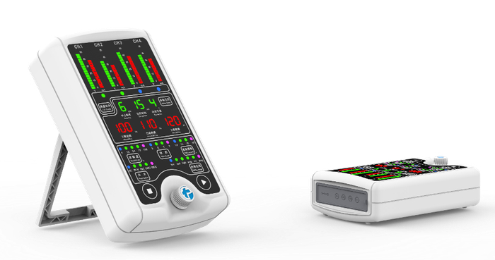 两路输出,两把治疗头,可单独使用;液晶显示,一键飞梭旋钮调节参数;具有过热保护自动监测系统。