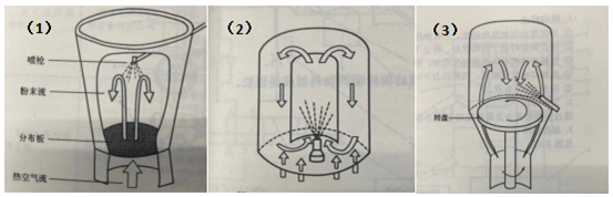 顶喷式一步制粒机的喷枪位置在物料运动的最高点,喷液方向与物料流动的方向一致,可避免物料将喷枪堵塞,适用于制粒;底喷式一步制粒机的喷枪位置在物料运动的最低点,喷液方向也与物料运动方向一致,适用于包衣;切线喷一步制粒的喷枪装在容器壁上,为保证喷雾均匀,底部通常配有旋转转盘使物料除上、下运动外,还有旋转运动形成螺旋状运动,适用于制粒、制微丸。