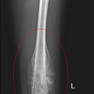 患者男性,14岁,患者在活动时出现左膝关节疼痛,以为是肌肉扭伤,没有在意,但1个月期间就出现疼痛加重并膝关节活动受限,不能忍受,5月在就近医院就诊后检查发现左股骨下段严重骨破坏并伴软组织肿物,考虑为恶性,这一结果对孩子家长来说无异于晴天霹雳,于天津多家三甲医院就诊咨询后,患者慕名来到了天津市肿瘤医院骨与软组织肿瘤科门诊,找到了杨蕴主任。经检查,肿瘤固定于左股骨下段,四周没有边界,压痛明显,左下肢活动困难,结合影像学检查,考虑为青少年典型骨肉瘤。经过术前新辅助化疗后,患者肿瘤边界清楚,具备保肢手术条件。