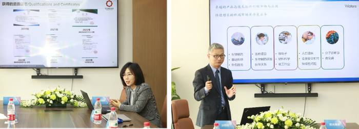 随后,郝光涛先生和任育华女士在现场签约。在双方领导以及安泰吉(北京)生物技术有限公司董事长岳国华先生的共同见证下,郝光涛先生和沃特世北区销售总监王则含先生共同为“DMPK应用技术合作示范平台”揭牌。北京阳光德美医药科技有限公司副总经理举晓霞女士和沃特世大中华区应用总监沈志扬先生分别就双方技术平台做了详细介绍。