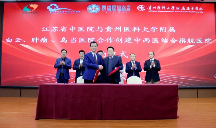 2023年2月10日至12日,江苏省中医院领导和专家团队一行在信邦集团旗下贵州医科大学附属白云、肿瘤、乌当医院,就共同打造中西医结合旗舰医院进行交流会谈。会议期间,信邦集团安怀略先生和江苏省中医院党委书记方祝元教授共同签署战略合作协议,正式开启打造中西医结合旗舰医院新征程,再谱双方战略合作新篇章。信邦集团总经理孔令忠、江苏省中医院副院长马朝群、江志伟、周恩超、贵州医科大学附属肿瘤医院党委书记金风、附属白云医院院长曾庆繁、附属乌当医院院长毛大华共同见证签约。