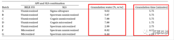 表3. 不同来源和不同粒度的SLS所需的水量和制粒时间