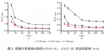 例如布洛芬纳米晶制备过程中,考察3种不同规格氧化锆珠(d=1.00、0.65、0.30mm)对研磨效果的影响。随着研磨时间延长,3种规格的粒径趋势走向平缓,60min差不多达到该研磨体系的最小粒径。选择0.3mm研磨珠时,可在较短时间达到更小粒径,故选择0.3mm研磨珠作为研磨介质。