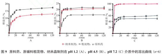 例如:布洛芬晶体制备研究中,将0.2gAPI、原辅料粗混物、纳米晶分别投入900ml的pH1.2、4.5和7.2介质中考察溶出曲线,结果得知:PH7.2介质中,纳米晶能够在10min内完全溶出,原辅料粗混物和API在2小时内仅分别溶出60.4%和30.7%,进一步说明粒径的优化减小可增强药物的溶解度,提高溶出速率。
