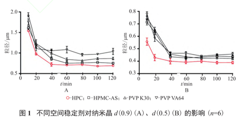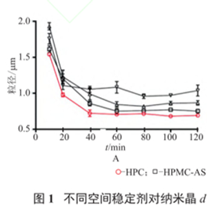 例如布洛芬纳米晶制剂制备中,选择SDS为离子稳定剂,HPC、HPMC-AS、PVP K30、PVP VA64等高分子辅料作为空间稳定剂,考察不同组稳定剂对产品粒径的影响。结果显示HPC作为空间稳定剂,药物颗粒粒径稳定效果最好,故选择HPC-SDS为组合稳定剂。