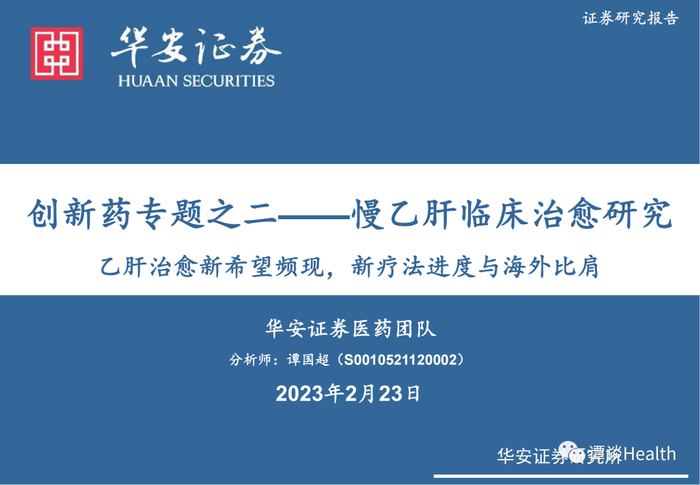【华安证券医药团队】2023年2月23日发布创新药专题之二:《慢乙肝临床治愈研究乙肝治愈新希望频现,新疗法进度与海外比肩》,欢迎与我们交流。