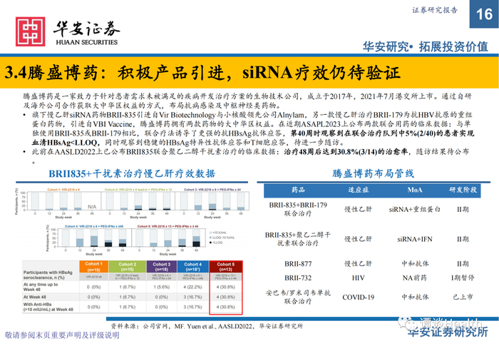 腾盛博药:多疗法布局:siRNA联用重组蛋白、siRNA联用干扰素均在II期临床阶段,处于国际第一进度梯队中,两种疗法目前对HBsAg清除率分别为5%及30.8%,疗效仍待验证。